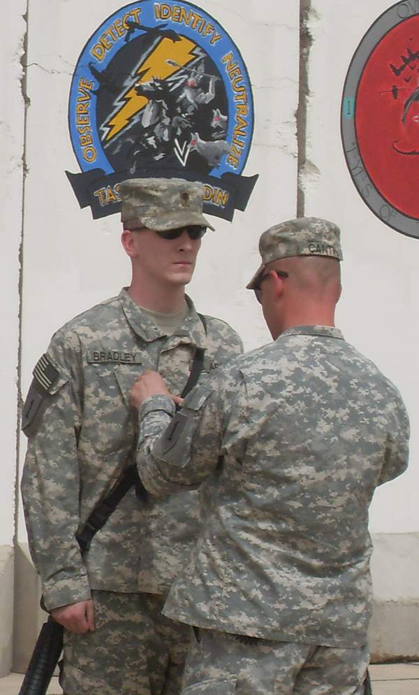 Lou DeVeaux pinning Chris' wings on. He is one of a small percentage of air crew that earn their wings, so this is special for that reason and also for the privilege of having his Dad pinning him.