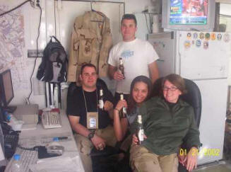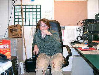 Well I am here and it's not so bad! The showers are shitty and getting food is a problem once in a while, but besides that, things are not what you would expect. We have not had any attacks although the people who have been here for a while say we are due. I am not worried. My job here is really interesting; I am again talking to aircraft and we are right in front of the flight line. We can see all the choppers doing their little operations and the planes landing, so it's quite interesting. I will take loads of pictures. The toilets are in tents and we have to walk up stairs to get to them and instead of a door it is a piece of canvas so that when you sit down your knees hit it! It's kind of funny if that wasn't what you were using for ninety days! Oh well it's good fun and an experience I will not forget! The people I work with seem OK; we will see with time, I guess. Umm, what else? I want to hear from you - write a lot and if you want to send letters that would be great. My address is: An email from Jessica, dated 4/4/04 to Paul: "Well, just know I am OK and tell Quin too if you can. We were just hit really bad and really close."