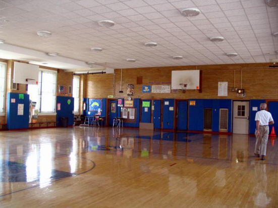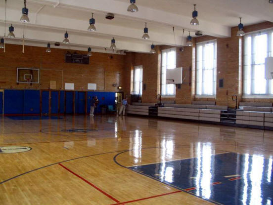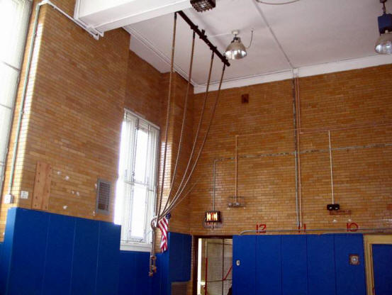 This is the 'Boys Gym' Note the hanging ceiling lights. This a view of the other end of the 'Boys Gym." I wonder if the ropes