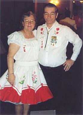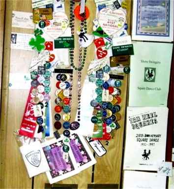 One of my pictures shows all of the badges, pins and awards that we have collected over the years. The other pictures of us were taken at different dances. My wife Rita, who has spent most of her life behind a sewing machine, makes all our outfits in her sewing shop. She has also made many an outfit for other square dancers during the time that we have been dancing. |